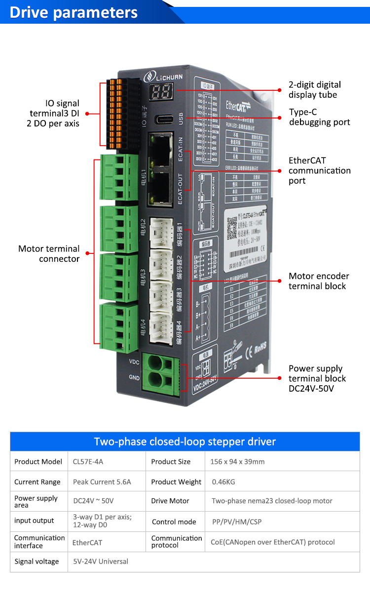 EtherCAT 2Phase Nema24 4-Achsen-DC-Schrittmotortreiber-Kit mit geschlossenem RegelkreisNeue Produkte EtherCAT 2Phase Nema23 4-Achsen-DC-Schrittmotortreiber-Kit mit geschlossenem Regelkreis, hergestellt in China mit CE/ROHS von LICHUAN®. Unsere Fabrik ist ein berühmter Hersteller und Zulieferer von EtherCAT 2Phase Nema23 4-Achsen-DC-Schrittmotortreibersätzen mit geschlossenem Regelkreis in China. Unser Produkt zeichnet sich durch hohe Qualität, Langlebigkeit, stabilen Betrieb und einen günstigen Preis aus. Und wir bieten maßgeschneiderte Dienstleistungen.