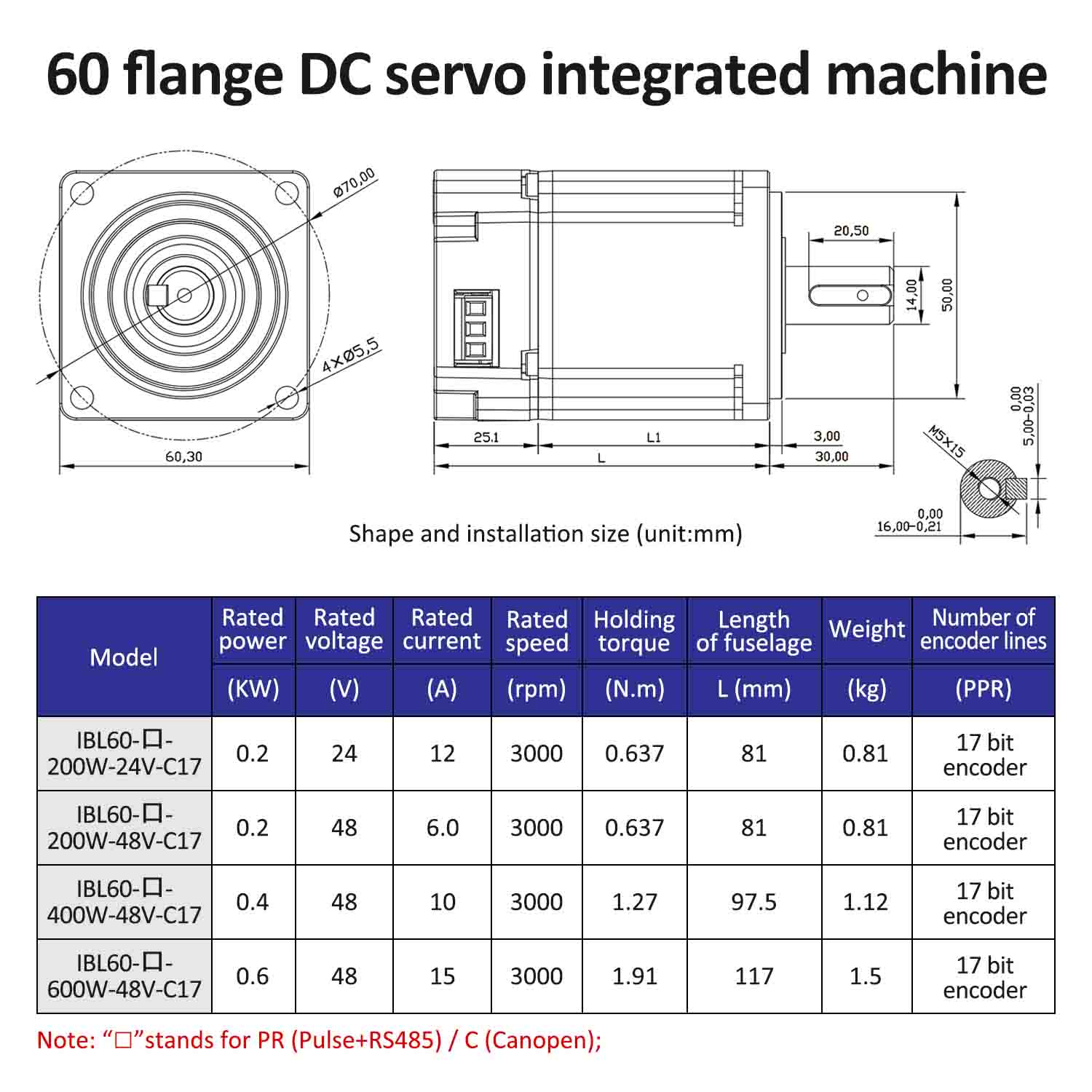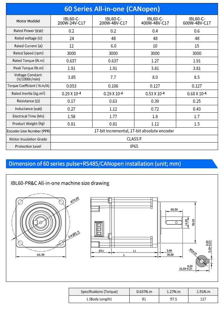 Integrierter Servomotortreiber von Lichuan, Impuls/RS485/CANopen-Steuerung, 600 W, 1,91 Nm, DC24/48 V, 6/10/12/15 A, 3000 U/min, IP65